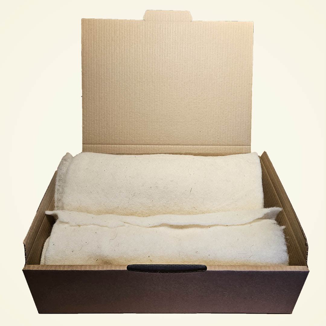 Löst filtad ull att använda som bandageunderlägg. Ullen skapar ett bra och torrt klimat mot benet. Tack vare värmeregleringen stödjer padden en god blodcirkulation som bidrar till läkning och välmående. Ullen andas och motverkar överhettning, den transporterar bort fukt från huden och ser till att skapa ett friskt klimat mot benet. Ullen är löst nålfiltad och innehåller mindre rester av strö från fårens naturliga levnadsmiljö.